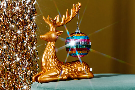 reindeer figurine with a disco ball hanging from its antlers