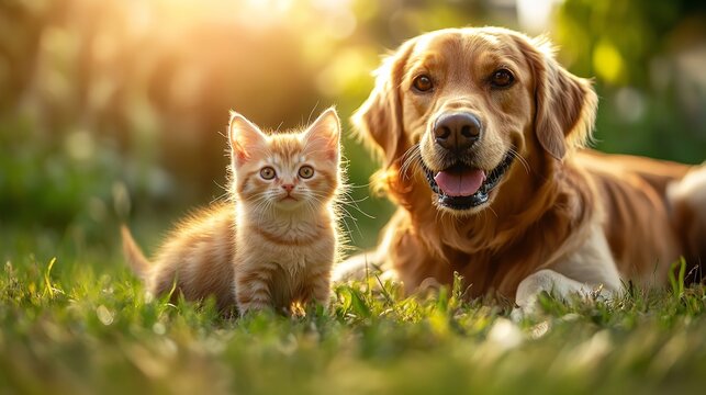 Close-up of a joyful cat kitten and a dog, captured during golden hour on a summer afternoon