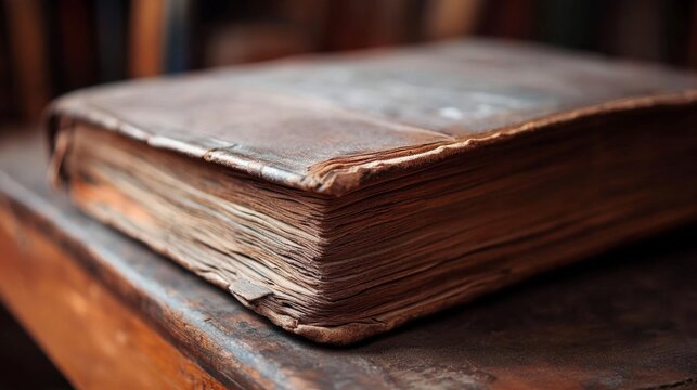 Aged book resting on a wooden surface.  The texture and rich colors speak to history.