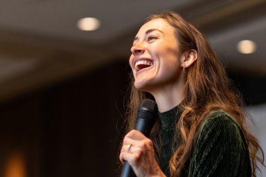 A businesswoman with a laptop in her hand showcases her confidence and empowerment, mastering of public speaking flawlessly. Her presentation is striking and captivates her audience, yellow background