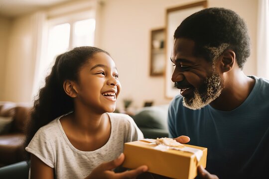 Young daughter giving father a gift on Father's Day, heartwarming moment of love and appreciation between parent and child, celebrating the special bond between a dad and his daughter, generative ai