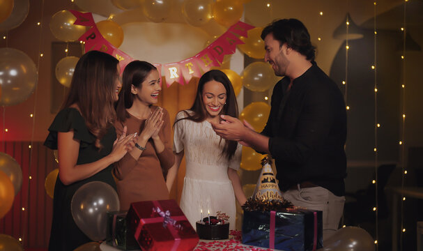 purple background with confetti and ribbons, champagne glasses, and copy space on the left side, celebrating a new year or birthday party.