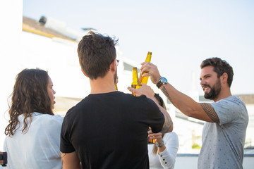 Happy joyful friends celebrating success and toasting beer on outdoor terrace. Young men and women in casual meeting outside. Celebration or friendly party concept