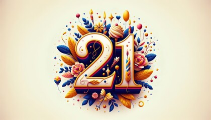 Festive number 21 with colorful decorations and vibrant elements, perfect for celebrating milestone birthdays, anniversaries, and special events