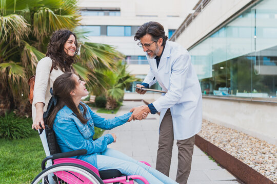 Doctor greeting young woman in wheelchair with caregiver outdoors - Smiling doctor greets young woman with cerebral palsy in wheelchair, accompanied by her caregiver - Inclusive healthcare concept.