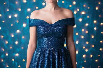 elegant woman in blue sequin dress against a sparkling blue background for a special occasion.
