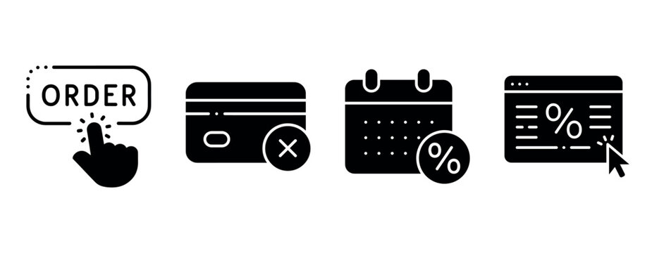 E-commerce icons: order, credit card decline, calendar discount, online offer