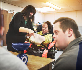 A teacher guides students with mental disabilities, including Down Syndrome, in sewing.