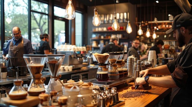 Baristas crafting drinks in a bustling specialty coffee shop.