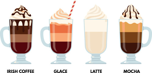 Detailed vector illustration set of four layered specialty coffee drinks in glass mugs, including Irish Coffee, Glace, Latte, and Mocha, all topped with whipped cream and syrup.