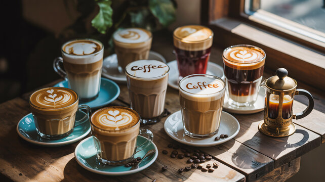 Assortment of delicious caramel and whipped cream topped coffee beverages in glass mugs png