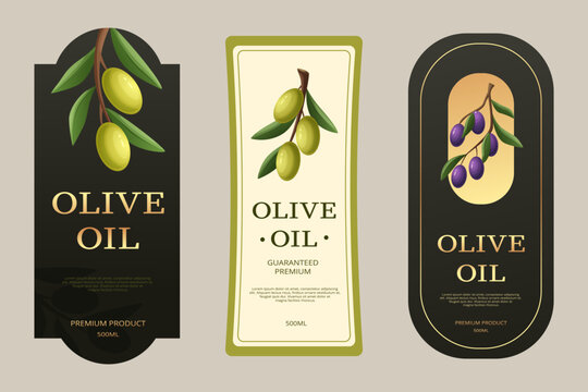 Elegant olive oil label set with realistic olive branches, premium typography, and minimal design. Ideal for packaging, branding, and gourmet food products.