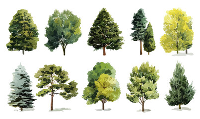 Illustrazione ad acquerello di diverse specie di alberi verdi e gialli isolati su sfondo trasparente.