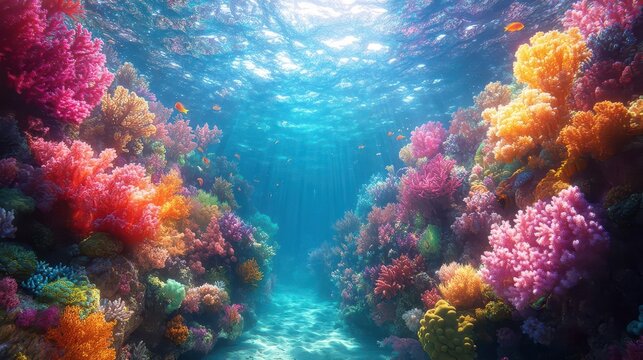 vibrant underwater coral reef teeming with colorful marine life shimmering light rays diverse fish species intricate coral formations crystalclear turquoise water tropical paradise