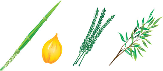 Sukkot four species set traditional symbols Holiday Four plants Etrog citron, hadas myrtle branches, lulav palm branch, aravah willow branches isolated icons Autumn Jewish New Year decoration sign