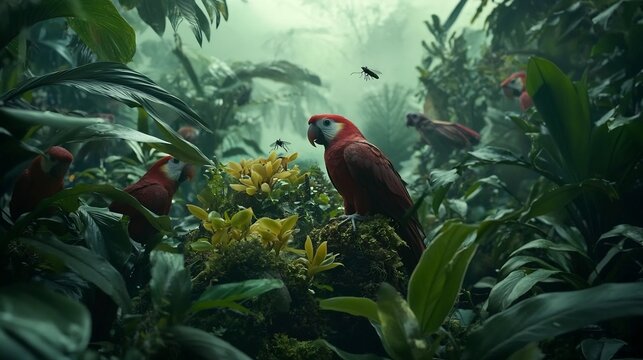 Complex ecosystem in a rainforest with diverse species of plants insects and animals interacting in perfect harmony under the canopy