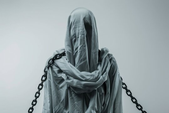 Ethereal, shrouded figure emerging from swirling, dark clouds in a dramatic, moody scene of spectral presence