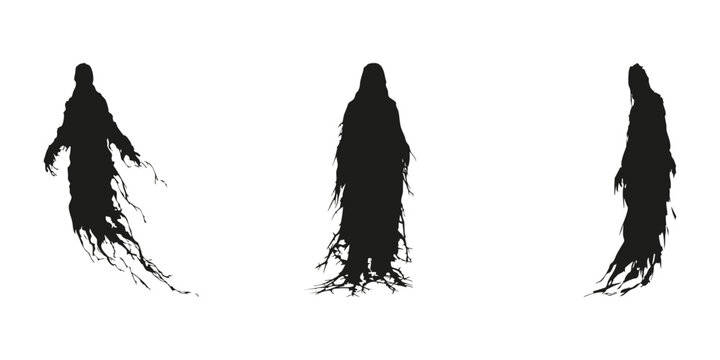 Ghostly Figures In Silhouette Set. Supernatural And Horror Theme Collection. Halloween And Spooky Design Use. Isolated Vector Illustration