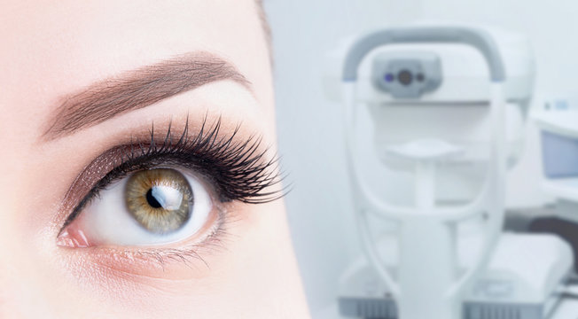 Female eye close-up on the background of ophthalmic equipment. Microscopy, vision diagnostics, treatment concept