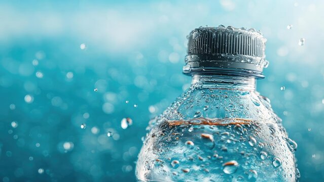 Close-up of a wet plastic water bottle cap with droplets on the bottle against a blue, bokeh-filled background. Concept Macro close-up, Wet plastic bottle cap, Water droplets, Blue bokeh background