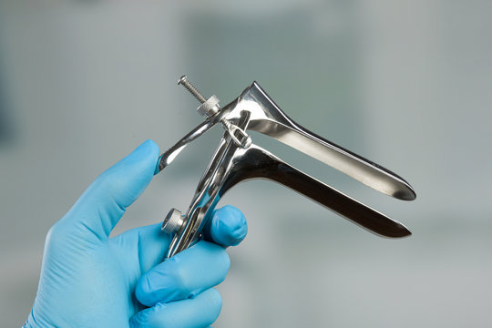 Cropped portrait of gynecologist in white lab coat and sterile gloves using vaginal speculum during pelvic exam