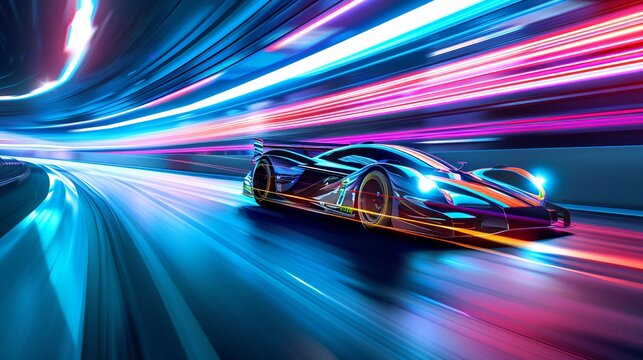 High speed futuristic race car with light trails on a track