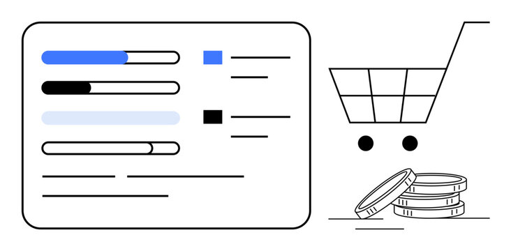 Shopping cart, progress bars, and stacked coins represent e-commerce, budgeting, and expense tracking. Ideal for retail, finance, savings, analysis consumer behavior business simple flat metaphor