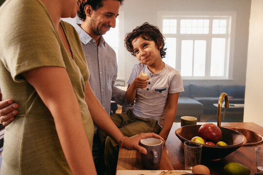 Boy eating a banana while spending time with his parents