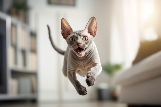 Medium shot portrait photography of a smiling sphynx cat sprinting against a cozy living room background. With generative AI technology