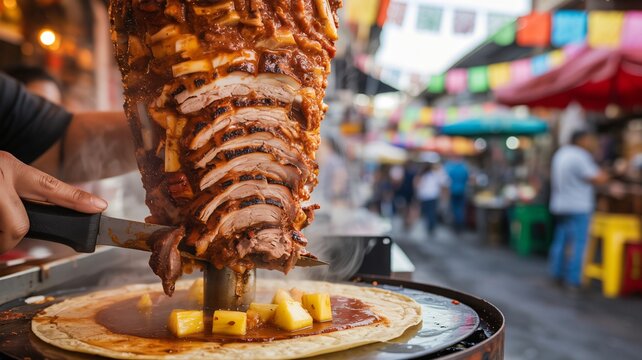 Chef carving sizzling al pastor meat from vertical rotisserie in street market