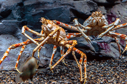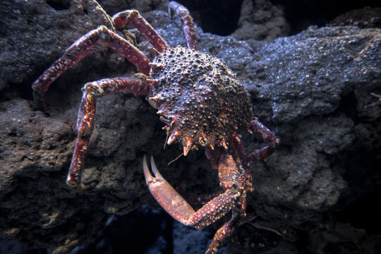 Japanese giant spider crab swimming underwater aquariumun on the rock ocean