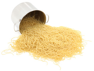 Spilled Bowl of Cooked Spaghetti on a White Background