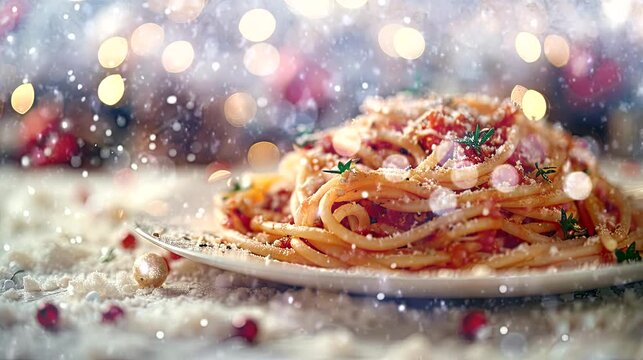 spaghetti spilling onto white carpet in snow white christmas . seamless looping time-lapse virtual 4k video animation