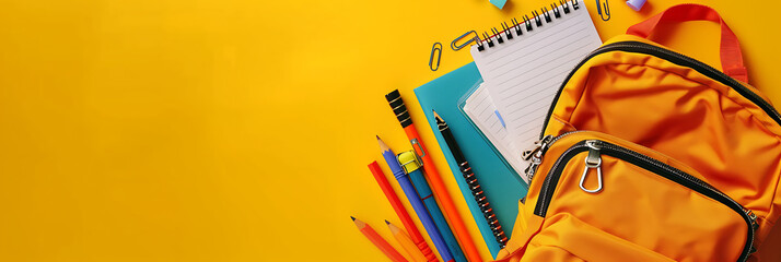 Top view flat lay style banner with a yellow school backpack and various stationery items like pencils and notebooks spilling out onto a bright yellow background.