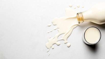 A bottle of milk is tipped over, spilling milk onto a white textured surface. Next to it is a glass filled with milk. The scene is minimalist and clean.