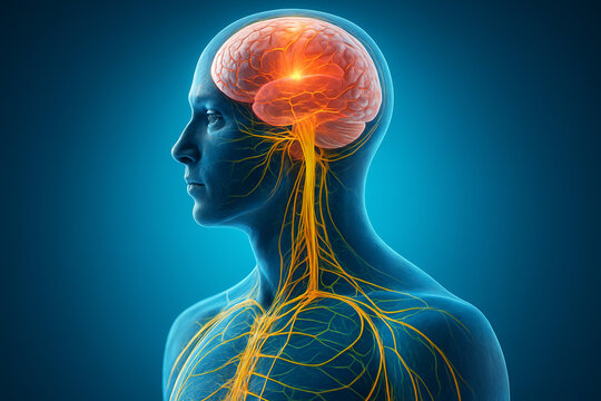 AI generated futuristic medical render showing human nervous system in profile with glowing brain blood vessels spinal cord and peripheral nerves in transparent body
