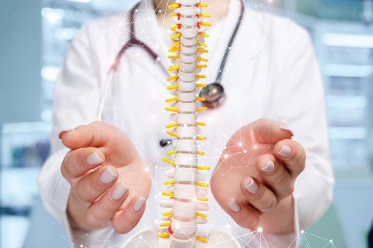A neurosurgeon pointing at lumbar vertebra model