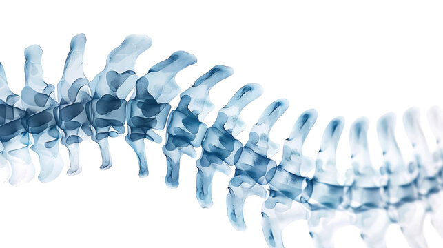 A rendering of a blue-toned spine focusing on a single vertebra, illustrating health concepts and framework within the human body, useful in medical contexts.