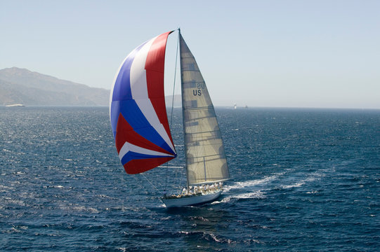 Flying a colorful spinnaker on a seaworthy sailing yacht