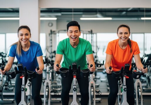 Happy diverse group cycling together in a modern gym for cardio and wellness training