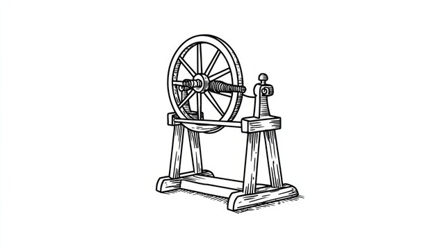 A black and white illustration of an antique wooden spinning wheel on a white background