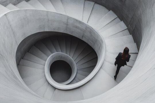 A woman walks up a spiral staircase. The staircase is very large and has many steps. The woman is wearing a black jacket and she is in a hurry