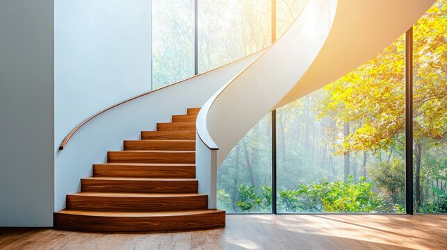 Modern spiral staircase in a contemporary building with large windows and sunset light.