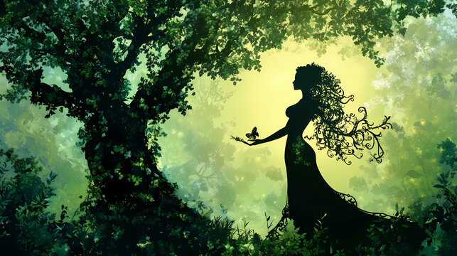 Majestic silhouette of a dryad, a nature spirit intertwined with an ancient mythical tree, set against the backdrop of a magical, lush forest in a fantasy art piece. Forest Dryad. Illustration