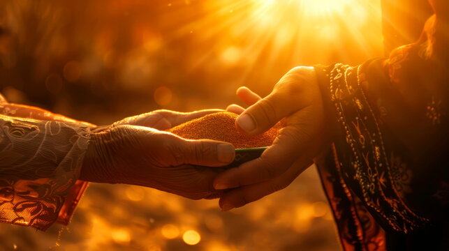 person giving zakat (charitable donation) to the needy during Ramadan, symbolizing the spirit of generosity. Generative AI