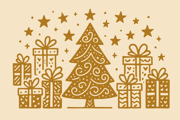 Golden Holiday Celebration. Collection of golden gift boxes and playful stars surrounds a central tree, symbolizing the spirit of giving and joy. The warm gold hues. Vector illustration
