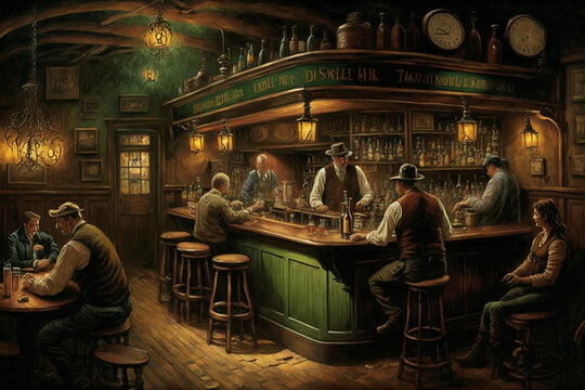 A bustling Irish pub, filled with jovial patrons raising their glasses in celebration. intricate details of wooden bar and stools. perfect for anyone who loves lively spirit of St. Patrick's Day. Ai