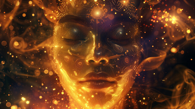 Illuminated profile, colorful aura, dark background, spiritual concept
