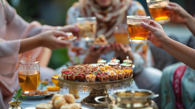 A group of friends sharing homemade sweets and tea after iftar, enjoying each other's company during Ramadan