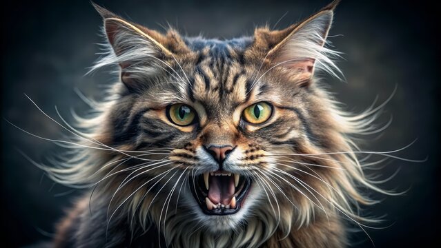 A furious, disheveled feline with mangy fur, whiskers askew, and beady eyes blazing with intensity, its ears flat, teeth bared in a menacing snarl.